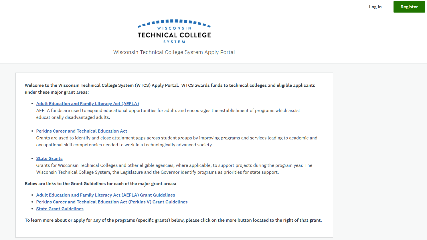 To access the WTCS eGrants system, go to the Wisconsin Technical College System Apply Portal. If you have questions or need technical support, please contact grants@wtcsystem.edu.